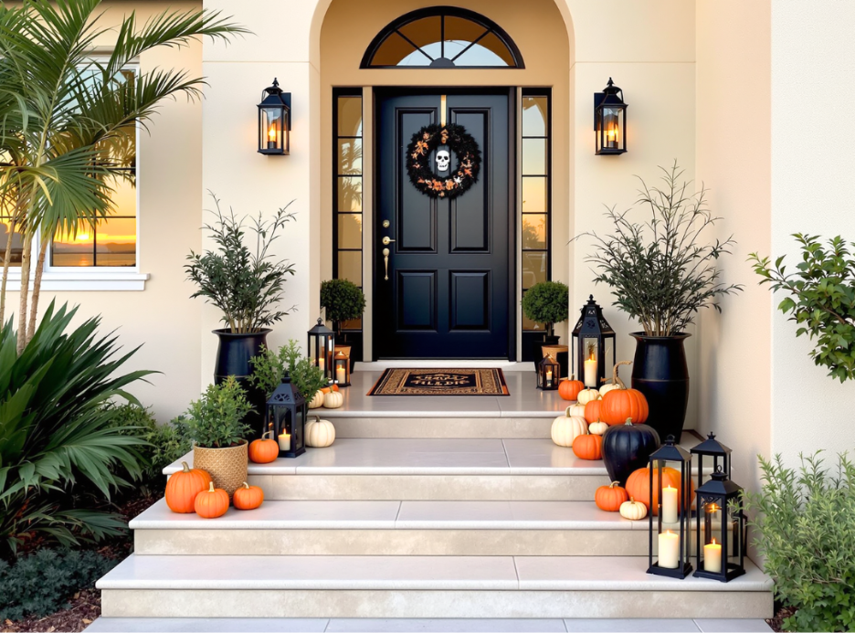 Even if you are short on time, last-minute DIY Halloween décor ideas can still make a big impression. Hang a few cobweb garlands across your doorway, add a string of mini pumpkin lights, or place a stylish ceramic pumpkin on your door. A quick interior design advice tip: use symmetry. Two matching lanterns or potted mums on either side of your entryway create instant balance and visual appeal, giving your Florida home a polished yet festive Halloween look.