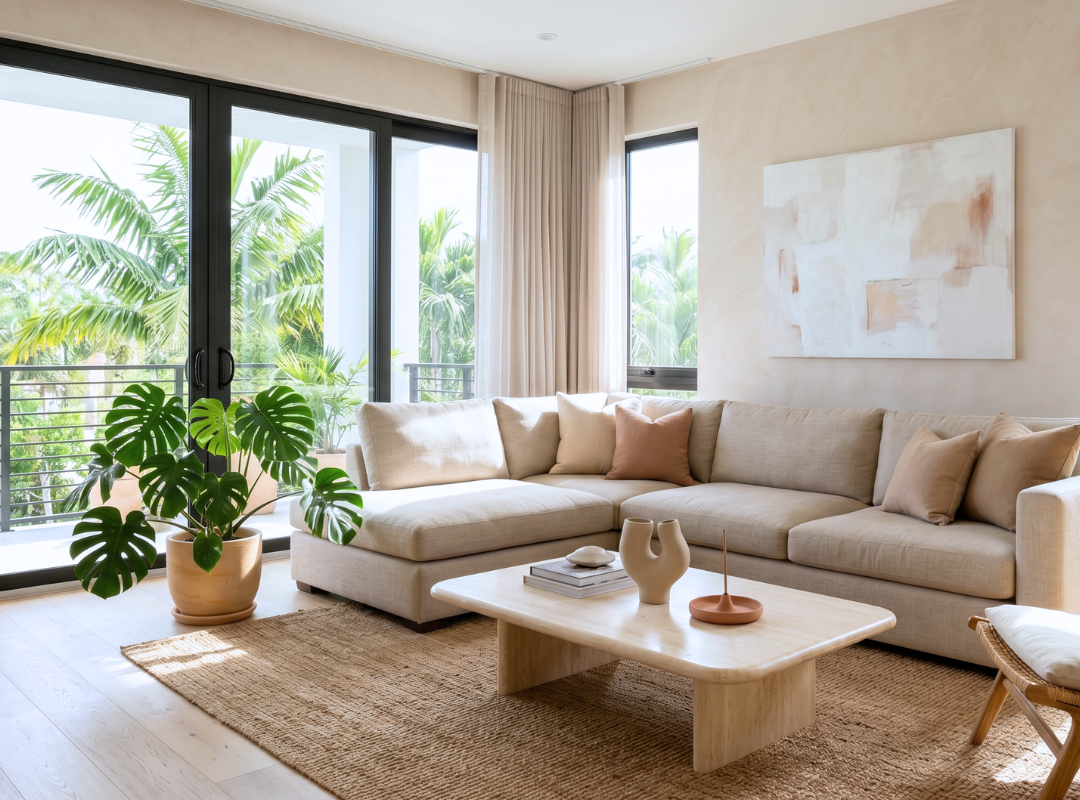 Organic modern interior design uses a warm, muted palette drawn from nature: sand, warm stone, aged linen, clay, sage, soft terracotta, and off-whites with yellow or green undertones. It avoids cool greys, bright whites, and bold primary colours. In Florida homes, these colours are chosen for how they hold up under intense natural light — warm tones perform better than cool ones in sun-filled spaces.